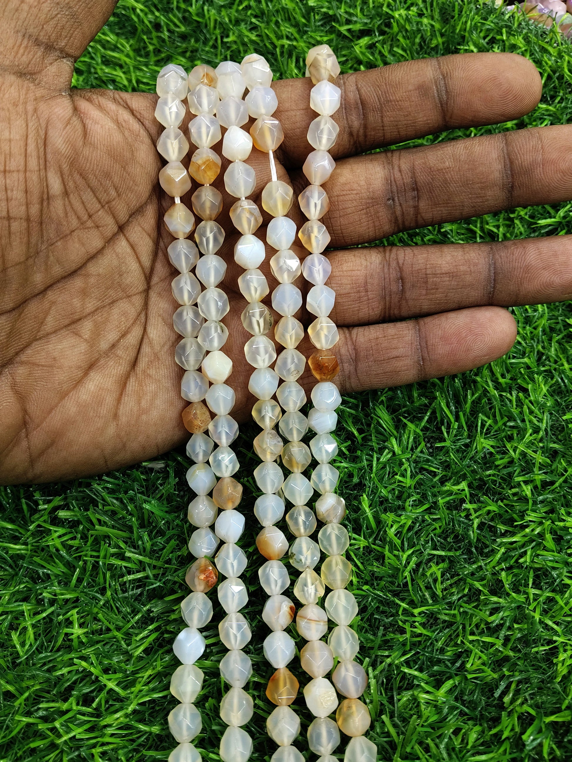 Enhance your jewelry designs with this exquisite string of premium, hand-cut faceted beads. These stunning beads feature a beautiful natural blend of milky white, translucent cream, and warm brownish-orange tones, reminiscent of high-quality Agate or Carnelian. The unique faceted shape catches the light beautifully, adding exceptional sparkle and texture to any piece.