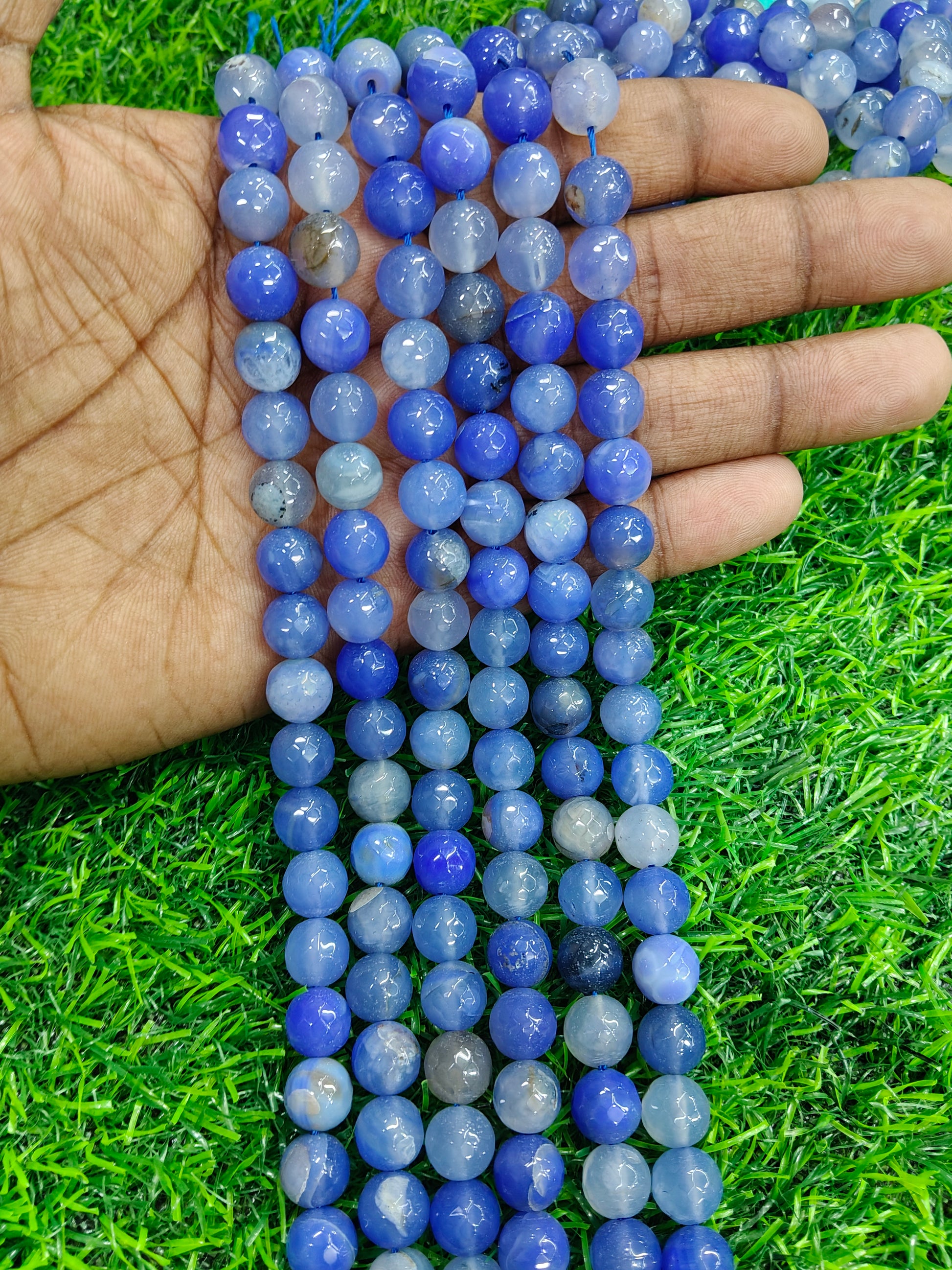 Dive into your next jewelry project with these mesmerizing Natural Blue Fire Agate Faceted Round Beads. These stunning beads feature a wonderful range of blues, from deep indigo to lighter, cloudy sapphire tones, creating a dimensional and captivating look.